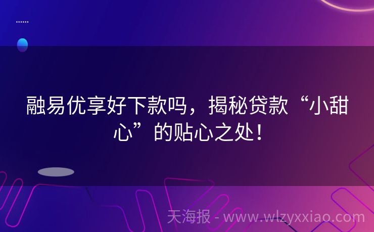 在这个“钱到用时方恨少”的时代,贷款成了不少人解决燃眉之急的“秘密武器”。而说到贷款,就不得不提一个名字——融易优享,它就像贷款界的“小甜心”,总让人忍不住想问:“融易优享好下款吗?”别急,咱们今天就来聊聊这个话题,顺便分享几个小故事,让你的贷款之路不再迷茫!