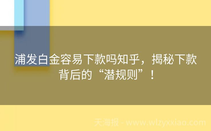 浦发白金容易下款吗知乎,揭秘下款背后的“潜规则”! 浦发白金容易下款吗?知乎热议背后的真相大揭秘! 最近在知乎上,关于“浦发白金容易下款吗”的讨论热度居高不下,有人晒出秒批截图,也有人吐槽申请多次被拒。作为金融圈摸爬滚打多年的“老江湖”,今天咱们就用轻松幽默的方式,聊聊这张让无数人又爱又恨的浦发白金卡,到底藏着哪些“下款密码”! 浦发白金卡下款难?先...