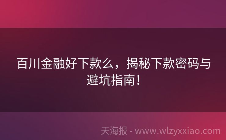 百川金融好下款么,揭秘下款密码与避坑指南! 百川金融好下款么?一篇文章带你揭秘! 最近后台收到好多小伙伴私信:“百川金融好下款么?”“申请被拒怎么办?”“有没有靠谱的替代方案?”别急!今天咱们就用“贷款小侦探”的视角,结合真实案例,把百川金融的“下款密码”和避坑指南一次性说清楚! 百川金融下款快不快?先看“通关条件”再决定! 要说百川金融的下...