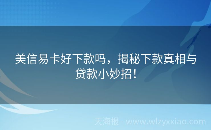 美信易卡好下款吗,揭秘下款真相与贷款小妙招! 美信易卡好下款吗?一篇文章让你秒懂贷款那些事儿! 在贷款江湖里,总有些“传说”让人心动不已,比如“秒下款”“无门槛”之类的词汇,就像江湖上的独门秘籍,让人忍不住想一探究竟。今天,咱们就来聊聊美信易卡这个“江湖高手”,看看它到底是不是传说中的那么好下款,顺便揭秘几个贷款小妙招! 美信易卡初印象:是“真...