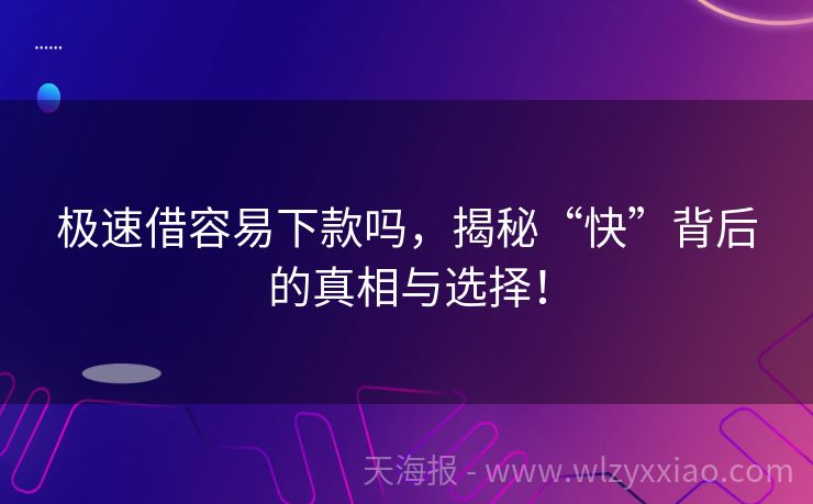 极速借容易下款吗,揭秘“快”背后的真相与选择! 极速借容易下款吗?揭秘贷款界的“速度与激情”! 在这个“时间就是金钱”的时代,连借钱都讲究个“快”字!你是不是也经常刷到“极速借,秒到账”的广告,心里痒痒的,却又半信半疑?别急,今天咱们就来聊聊这个话题——极速借,真的那么容易下款吗? 小李的“极速”经历:从心动到行动 小李是个上班族,最近手头有点紧...